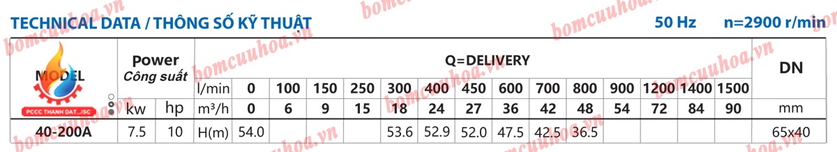 Bảng thông số kỹ thuật chi tiết của máy bơm chữa cháy Inter CM 40-200A
